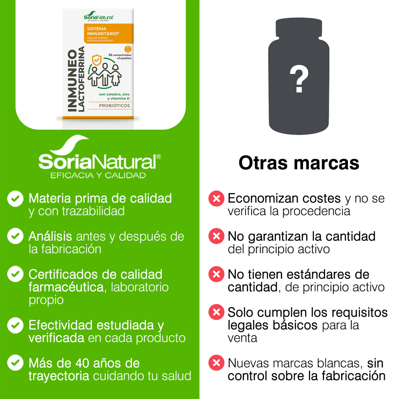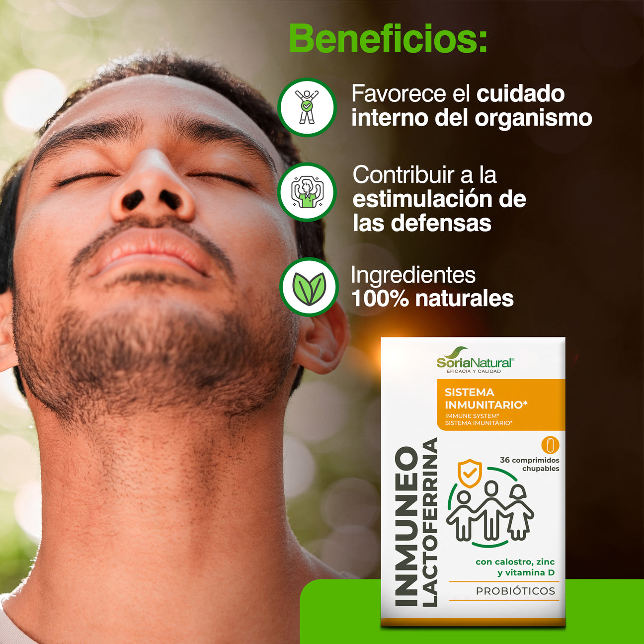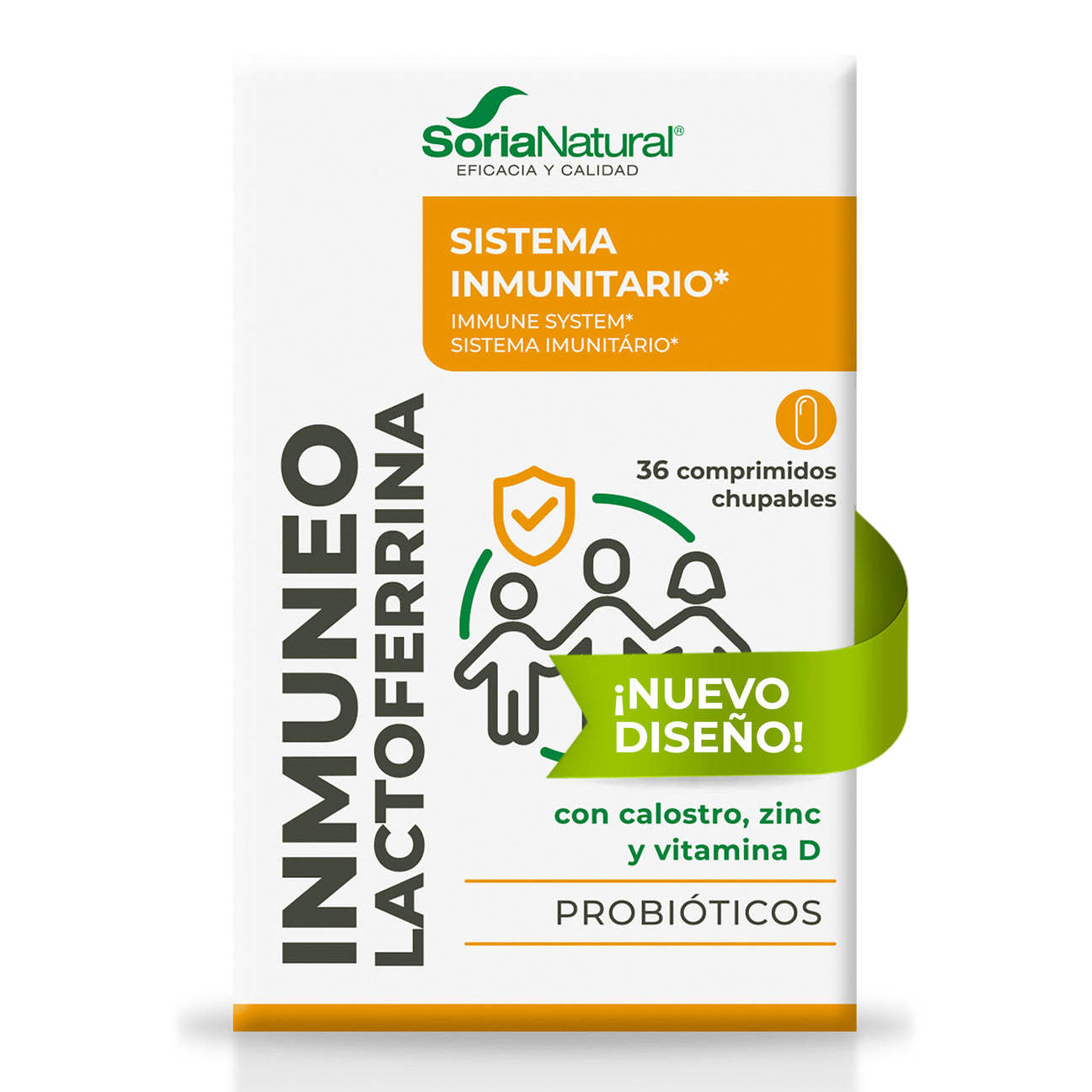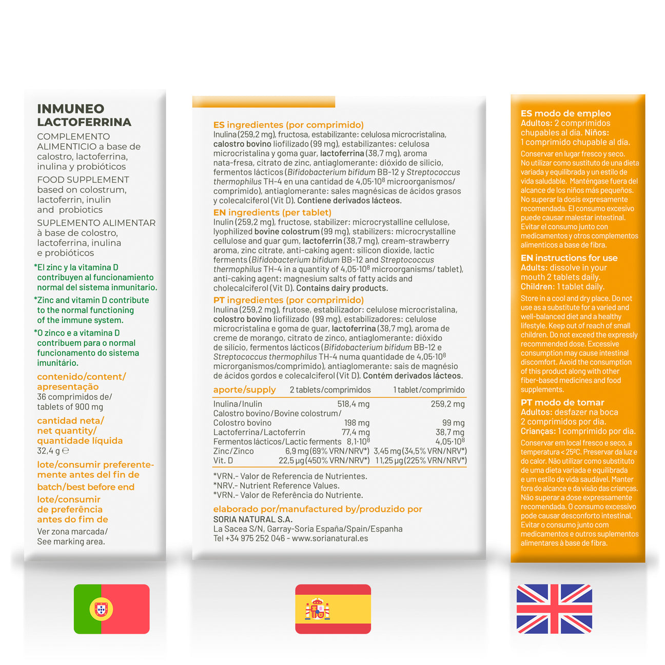 por comprimido: Inulina (259,2 mg), fructosa, estabilizante: celulosa microcristalina, calostro bovino liofilizado (99 mg), estabilizantes: celulosa microcristalina y goma guar, lactoferrina (38,7 mg), aroma nata-fresa, citrato de zinc, antiaglomerante: dióxido de silicio, fermentos lácticos (Bifidobacterium BB-12 y Streptococcus thermophilus TH-4 en una cantidad de 4,05.108. microorganismos/comprimido), antiaglomerante: sales magnésicas de ácidos grasos y colecalciferol (Vit D).