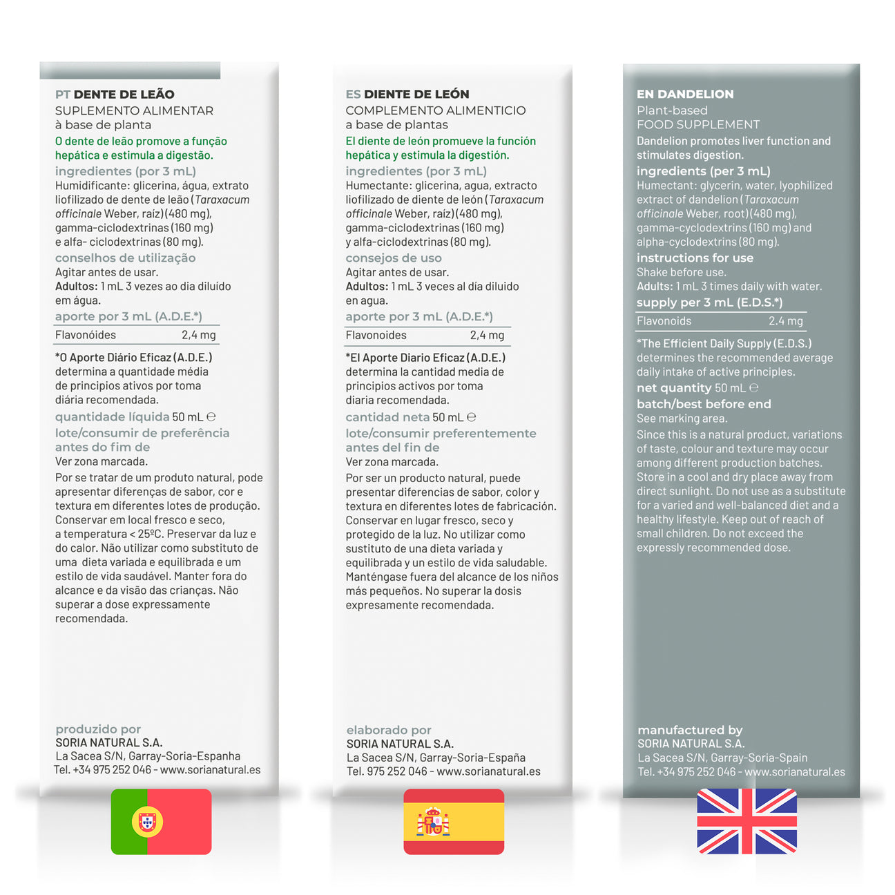Extracto liofilizado de diente de león (480 mg), Gamma ciclodextrinas (160 mg), Alfa ciclodextrinas (80 mg), Agua, Glicerina.