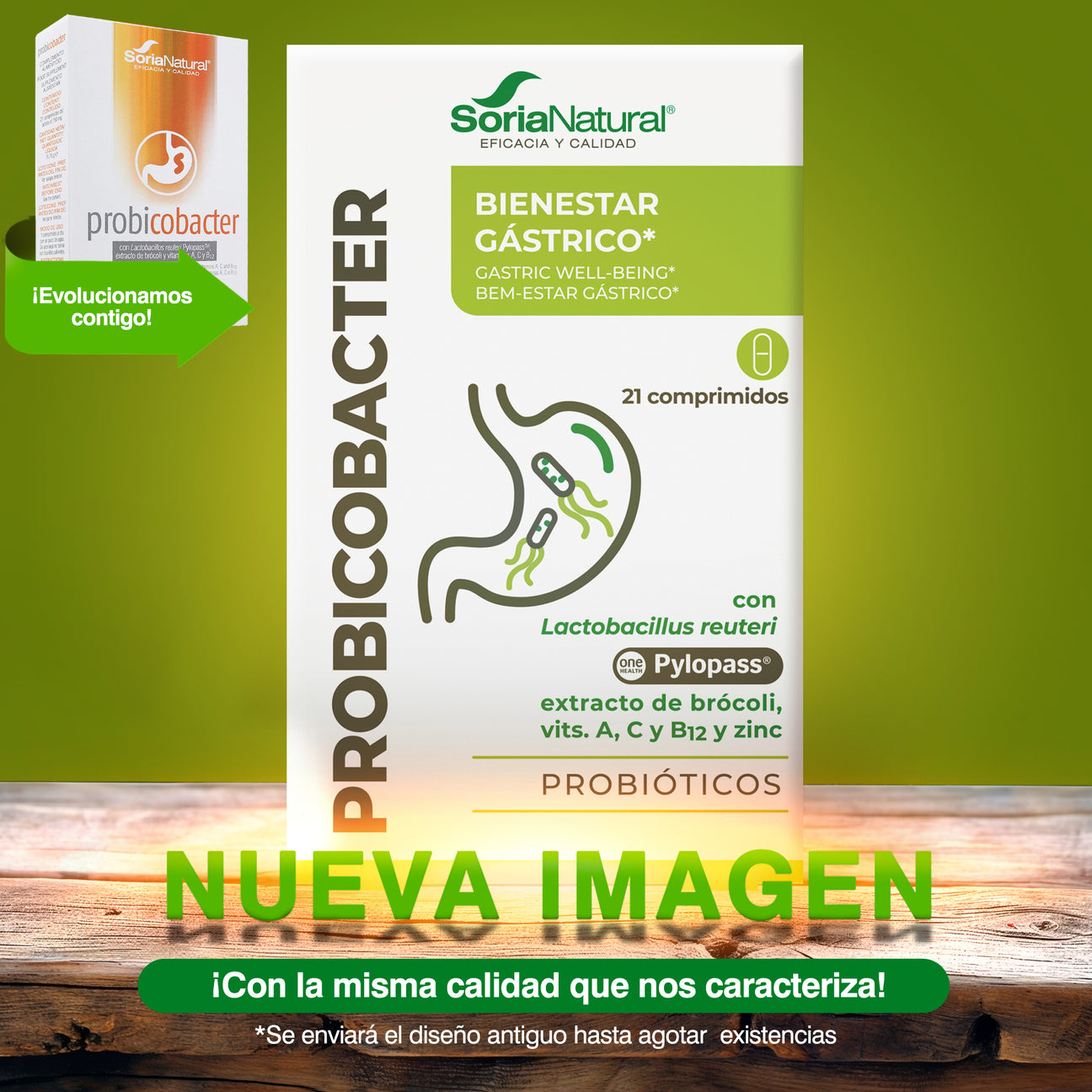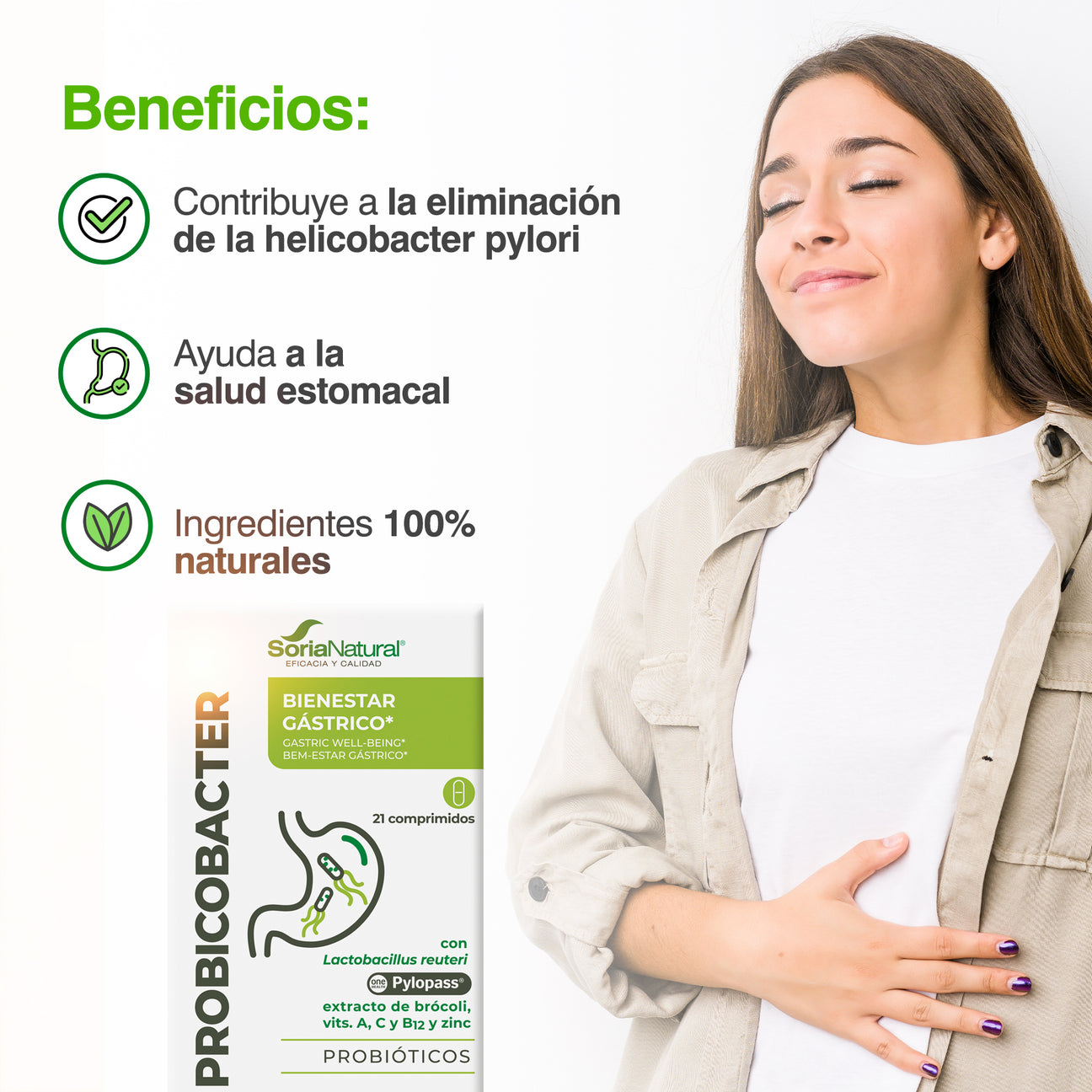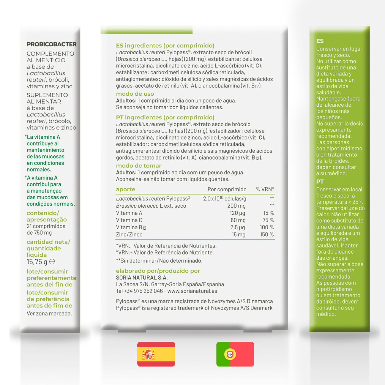 Probicobacter está elaborado con Pylopass™, un probiótico específico que actúa coagregados con Helicobacter pylori y facilitando su expulsión del organismo; además contiene extracto seco de brócoli, vitaminas y minerales que refuerzan la acción del probiótico, favorecen la regeneración y cicatrización del epitelio gastrointestinal y proporcionan un aporte extra de estos nutrientes al organismo.