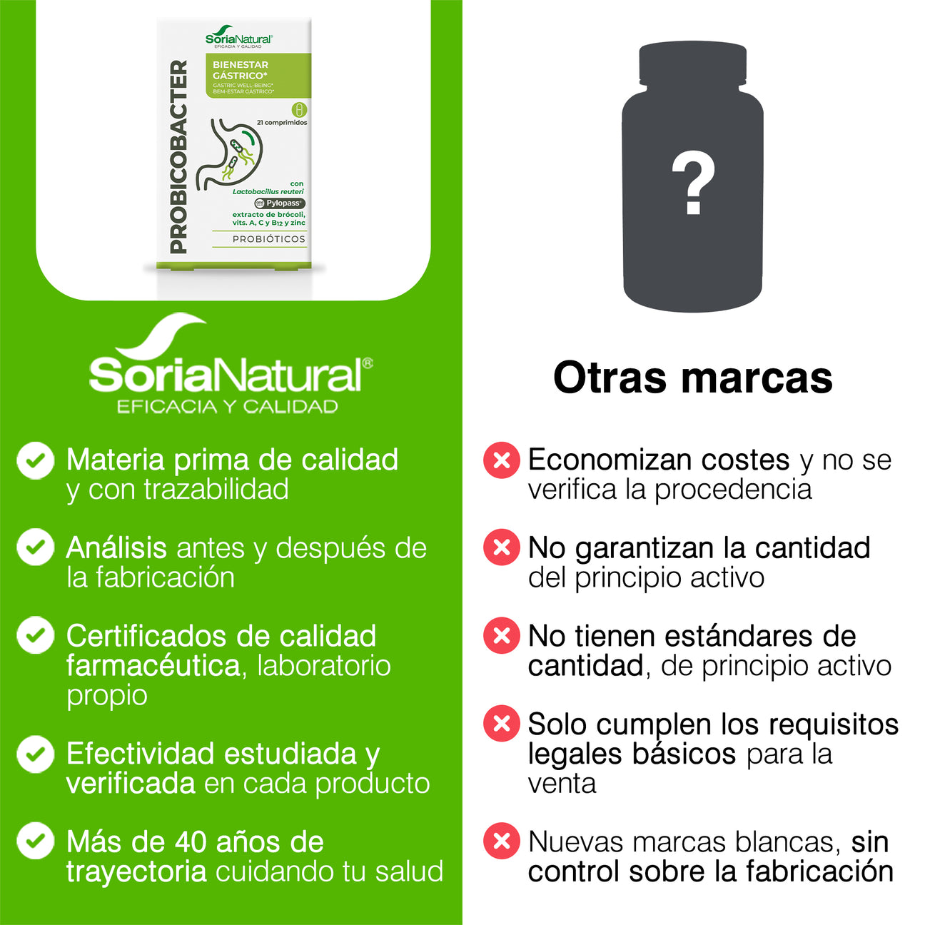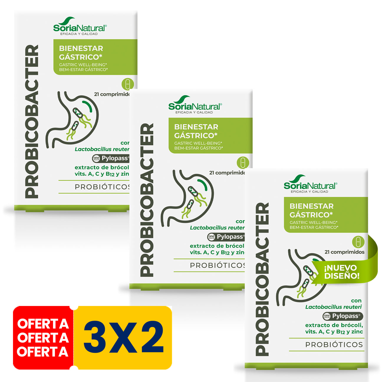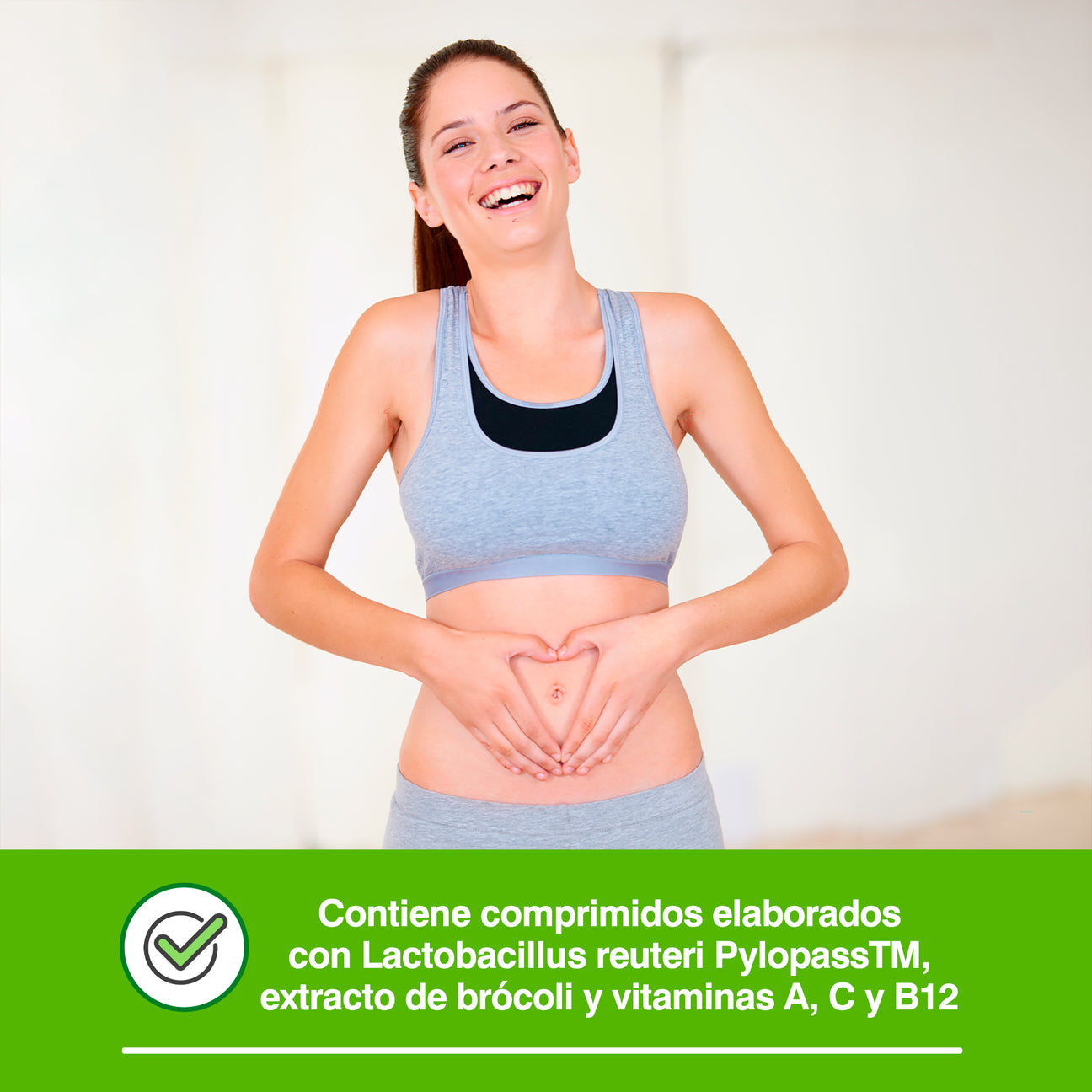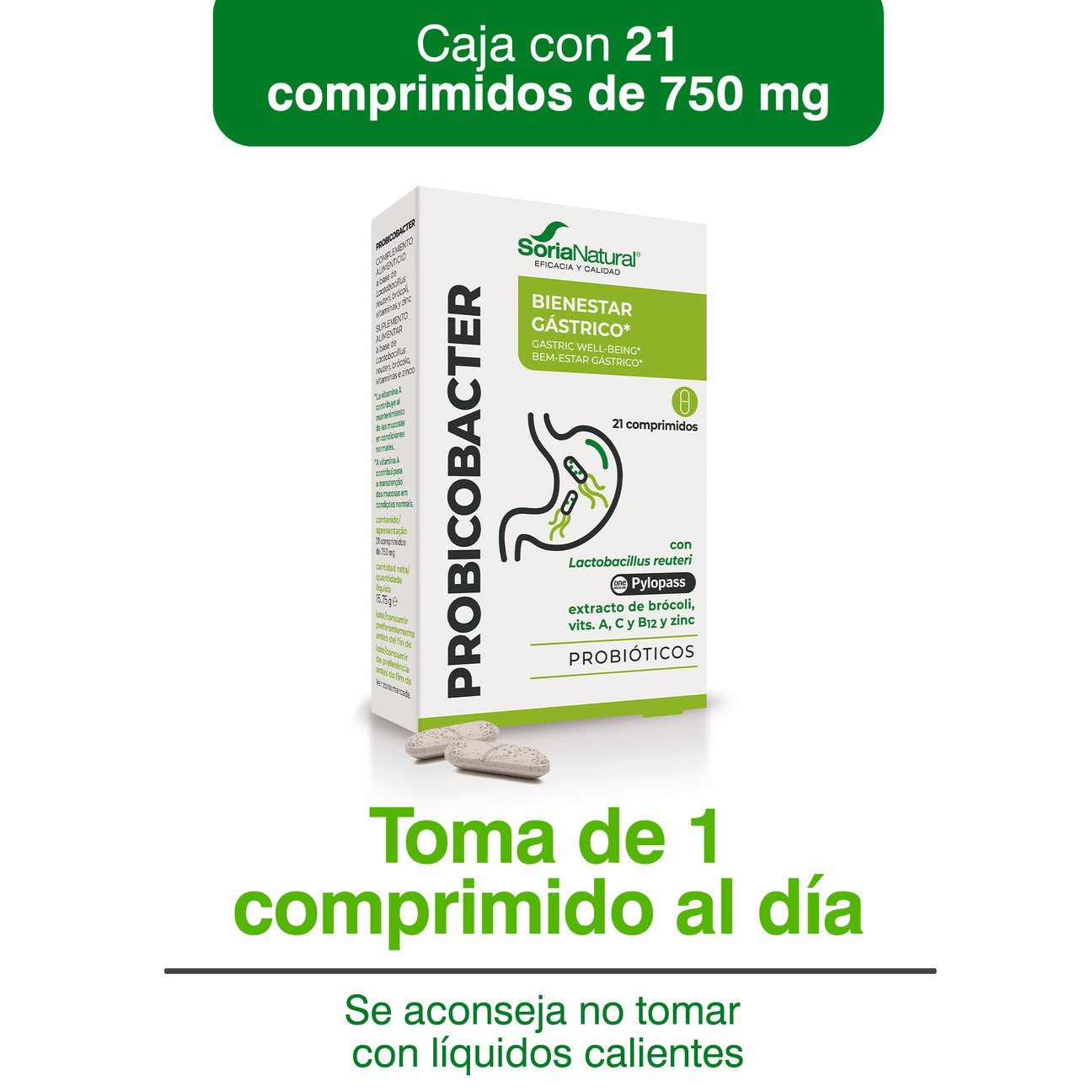 Probicobacter está elaborado con Pylopass™, un probiótico específico que actúa coagregados con Helicobacter pylori y facilitando su expulsión del organismo; además contiene extracto seco de brócoli, vitaminas y minerales que refuerzan la acción del probiótico, favorecen la regeneración y cicatrización del epitelio gastrointestinal y proporcionan un aporte extra de estos nutrientes al organismo.