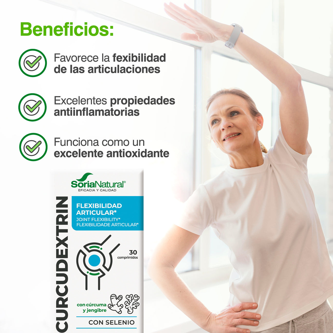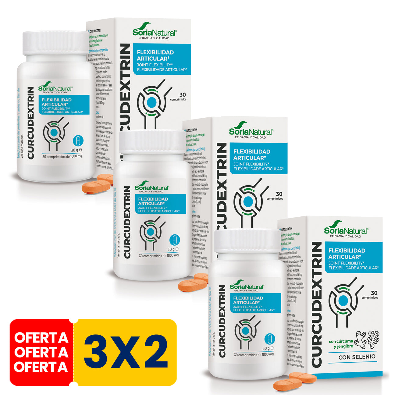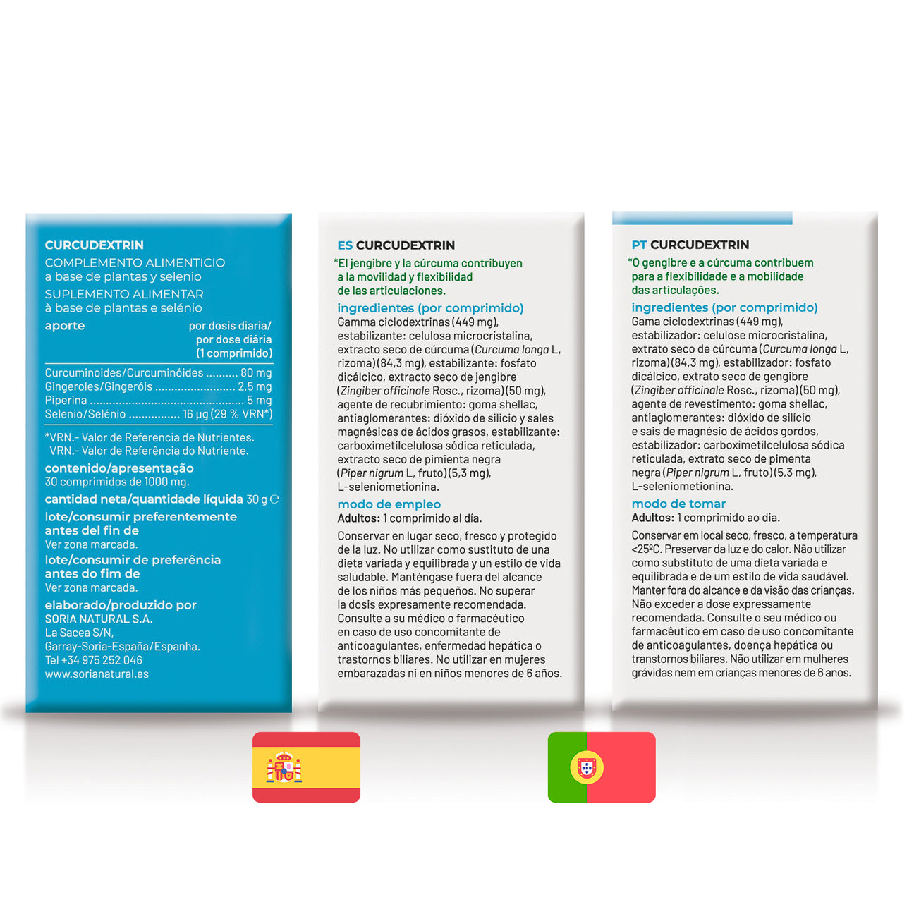 Por 1 comprimido: Gamma ciclodextrinas (449 mg), Estabilizantes: celulosa microcristalina y fosfato dicálcico, Extracto seco de cúrcuma (Curcuma longa L, Rizoma (95% curcuminoides))(84,3 mg), Agente de recubrimiento: goma shellac, Antiaglomerante: sales magnésicas de ácidos grasos, Estabilizante: carboximetilcelulosa sódica reticulada, Extracto seco de pimienta negra (Piper nigrum L, fruto (95% piperina))(5,3 mg), Antiaglomerante: dióxido de silicio, seleniometionina.