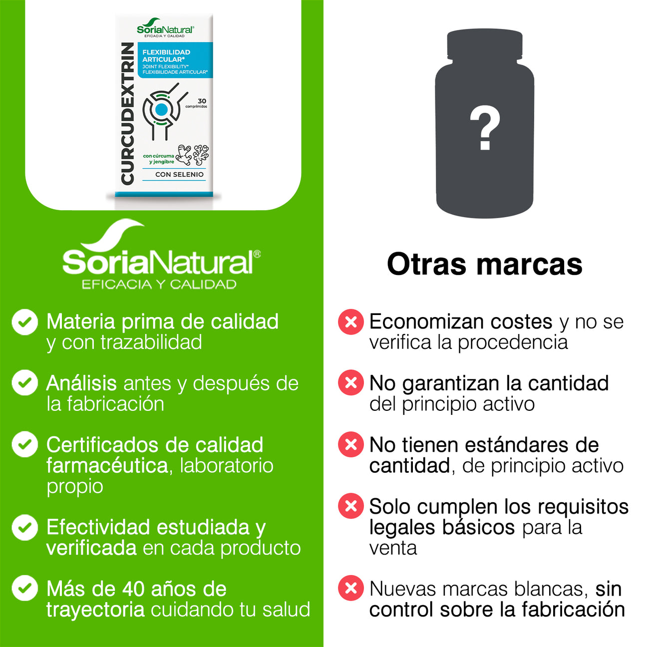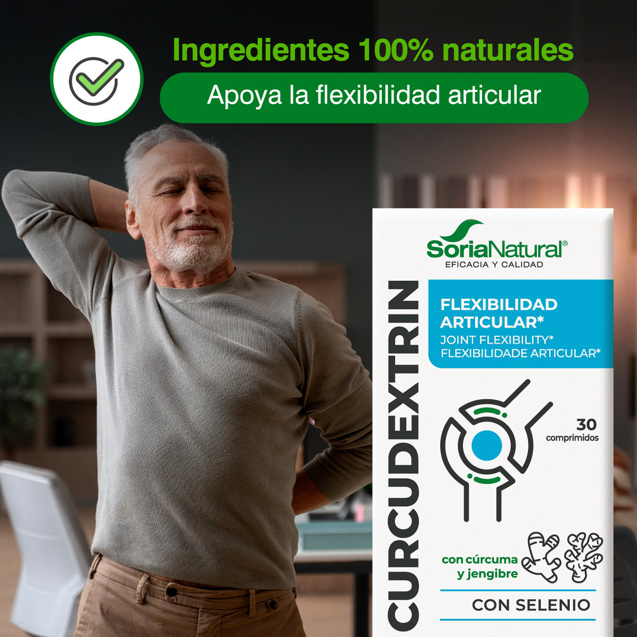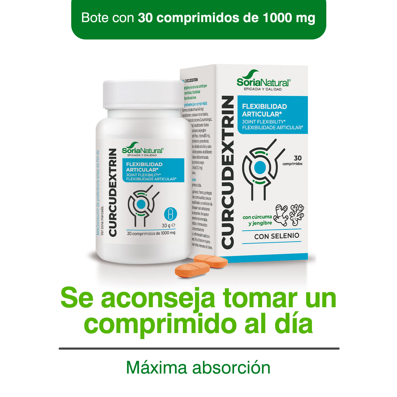 Por 1 comprimido: Gamma ciclodextrinas (449 mg), Estabilizantes: celulosa microcristalina y fosfato dicálcico, Extracto seco de cúrcuma (Curcuma longa L, Rizoma (95% curcuminoides))(84,3 mg), Agente de recubrimiento: goma shellac, Antiaglomerante: sales magnésicas de ácidos grasos, Estabilizante: carboximetilcelulosa sódica reticulada, Extracto seco de pimienta negra (Piper nigrum L, fruto (95% piperina))(5,3 mg), Antiaglomerante: dióxido de silicio, seleniometionina.