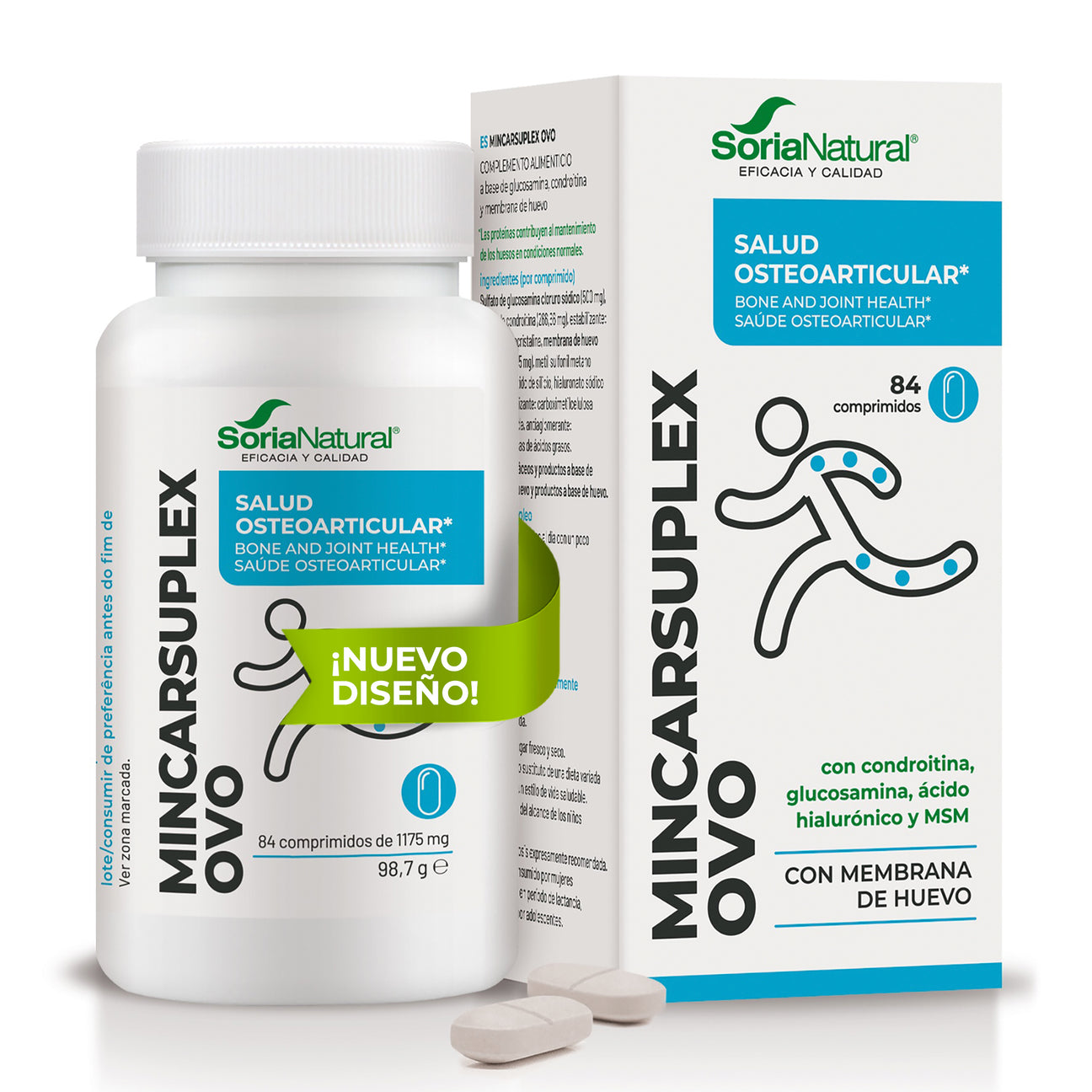 Pero además, Mincarsuplex OVO está suplementado con un componente novedoso, la membrana del huevo, una sustancia natural, eficaz y sin efectos secundarios con acción antiinflamatoria, analgésica y con capacidad de regenerar el cartílago, que actúa en sinergia con el resto de componentes para hacer de Mincarsuplex OVO un producto único en el mercado y excepcional, para el tratamiento de cualquier tipo de trastorno articular, ya que contribuye a disminuir el dolor e incrementar la funcionalidad de las articulaciones y, además, a mejorar el aspecto de la piel.