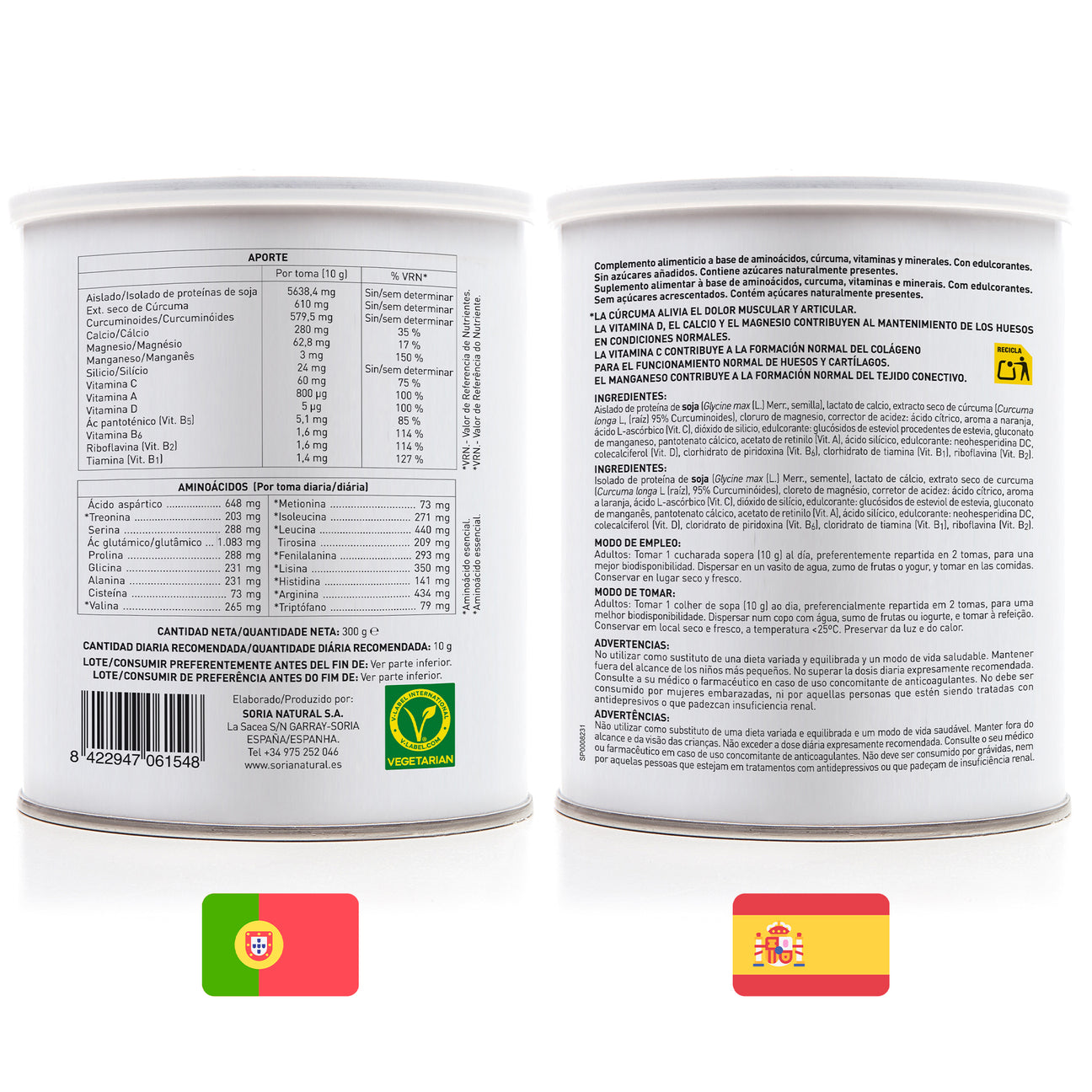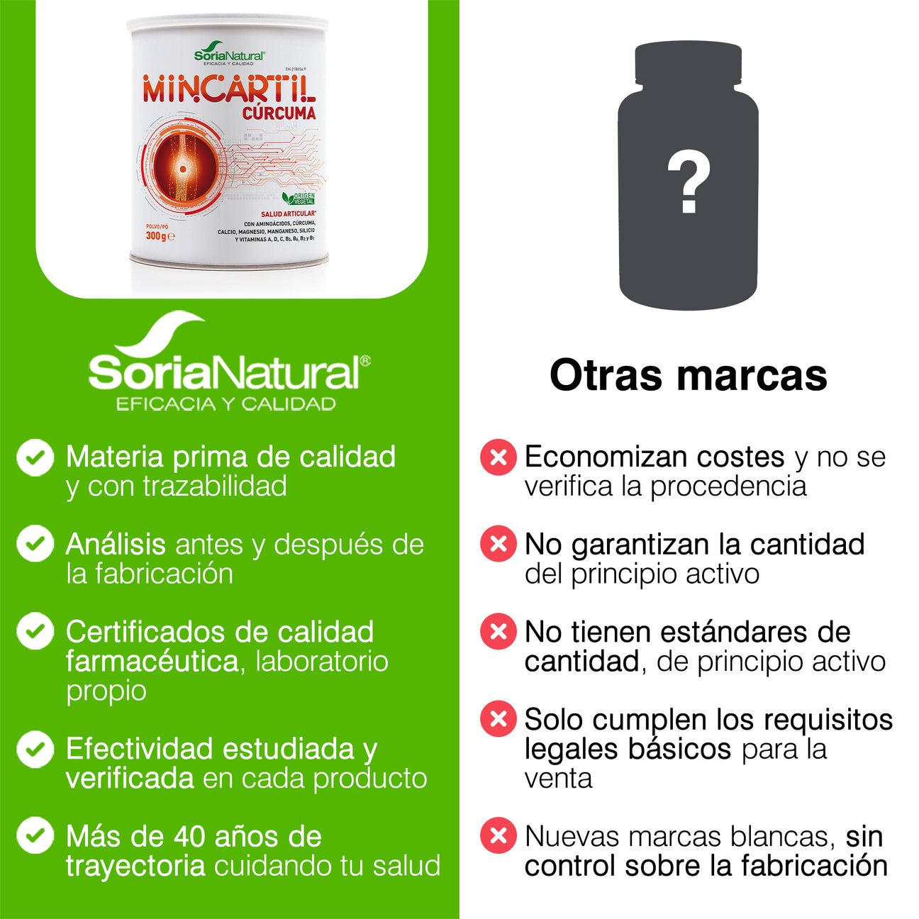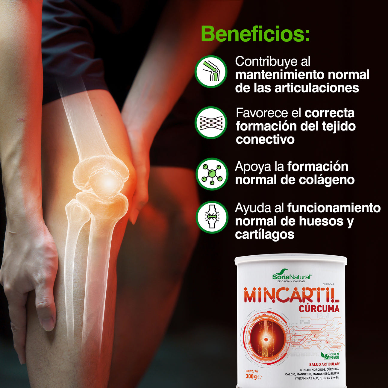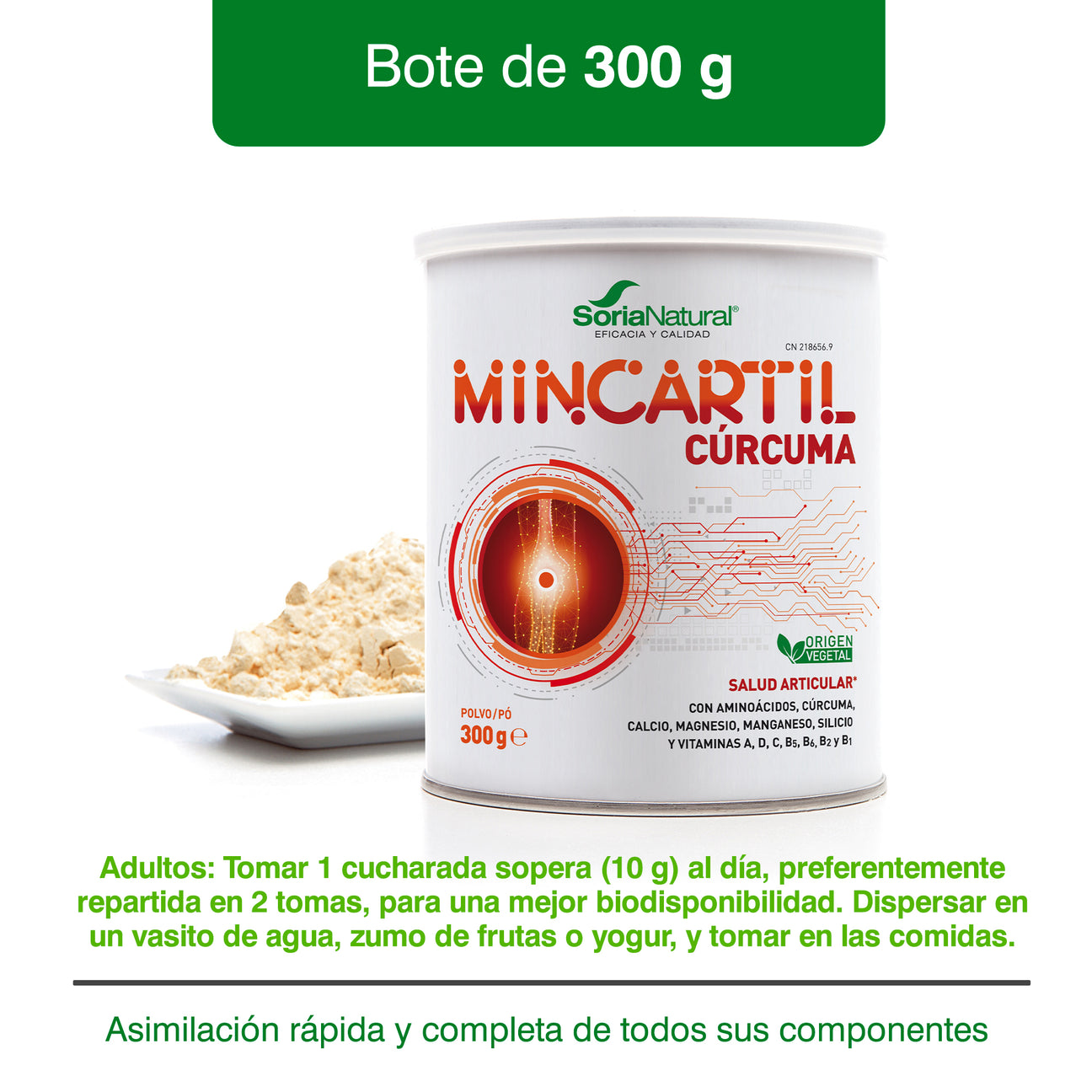Mincartil Cúrcuma de Soria Natural es un complemento alimenticio elaborado a base de aminoácidos de origen vegetal (soja y arroz), enriquecido con vitaminas y minerales y reforzado con Cúrcuma longa. Indicado para aquellas personas con problemas o molestias articulares y musculares (deportistas...).