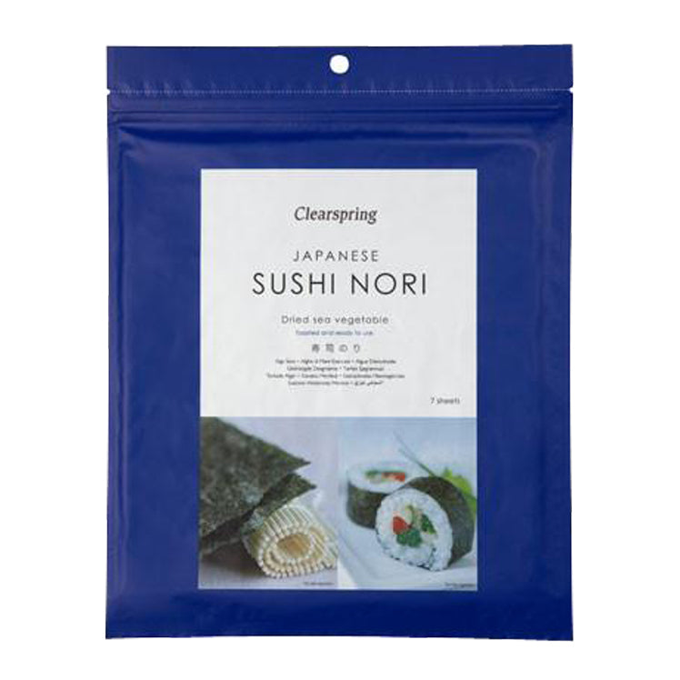 Composicion: Nori seco y tostado (Pyropia yezoensis)\ \ Valor nutricional por 100 g:\ Energía kJ: 1279\ Energía kCal: 307\ Grasas: 5.3 g\ de los cuales se saturadas: 1,5 g\ Carbohidratos: 3.2 g\ de los cuales azúcares: 1,7 g\ Fibra: 37 g\ Proteína: 43 g\ Sal: 1.4 g\ \ *Puede contener trazas de partículas de pescado, moluscos y / o crustáceos.