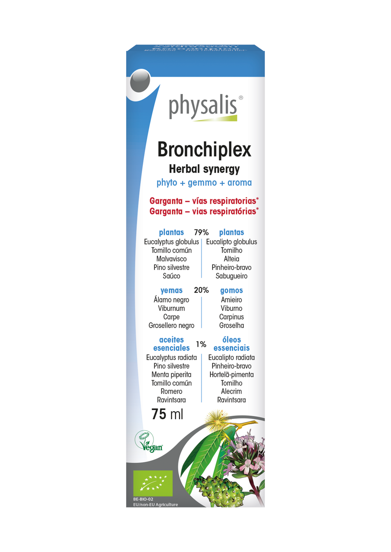 Composicion: Extractos hidro-alcohólicos de eucalyptus globulus* (15,8%), tomillo común* (15,8%), malvavisco* (15,8%), pino silvestre* (15,8%) y saúco* (15,8%), extractos hidro-alcohólicos glicerinados de yemas de álamo negro* (5%), viburnum* (5%), carpe* (5%) y grosellero negro* (5%), aceites esenciales de eucalyptus radiata* (0,4%), pino silvestre* (0,15%), menta piperita* 0,15%), tomillo común* (0,1%), romero* (0,1%) y ravintsara* (0,1%).\ \ (*)= De cultivo ecológico.