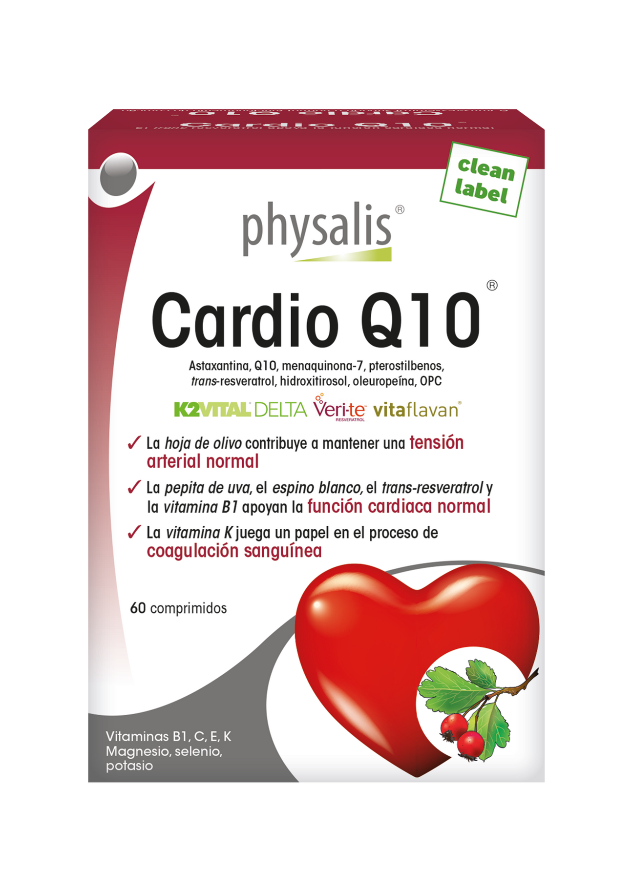 Indicaciones: Compuesto constituido por una combinación sinérgica de plantas (fito-nutrientes, entre ellos la pepita de uva, espino blanco, resveratrol y vitamina B1, sustancias que apoyan la función cardíaca. El potasio y el extracto de hoja de olivo (a 20% de oleuropeína) contribuyen a mantener una tensión arterial normal. La vitamina K, bajo la forma de MK-7 de doble protección y encapsulada (K2VITAL® Delta), juega un papel en el proceso de coagulación sanguínea. El magnesio participa en la función muscular, y por ello en las contracciones del músculo cardíaco. La vitamina E y el selenio, intervienen en la protección de las células contra el estrés oxidativo, al igual que la vitamina C, que apoya también la formación del colágeno para asegurar el mantenimiento del buen funcionamiento de los vasos sanguíneos.