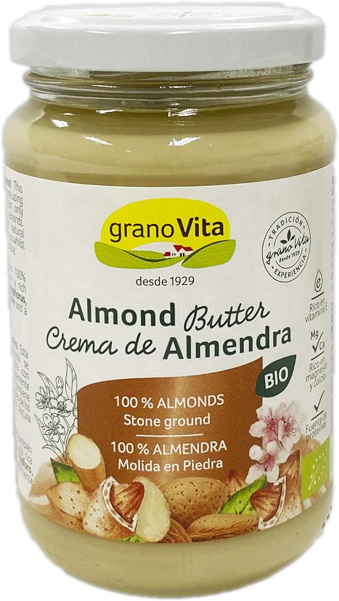 Indicaciones: Crema de almendra ecológica, sin gluten. Se elabora en molino de piedra para mantener los nutrientes y el sabor natural de la almendra aportando una textura cremosa.