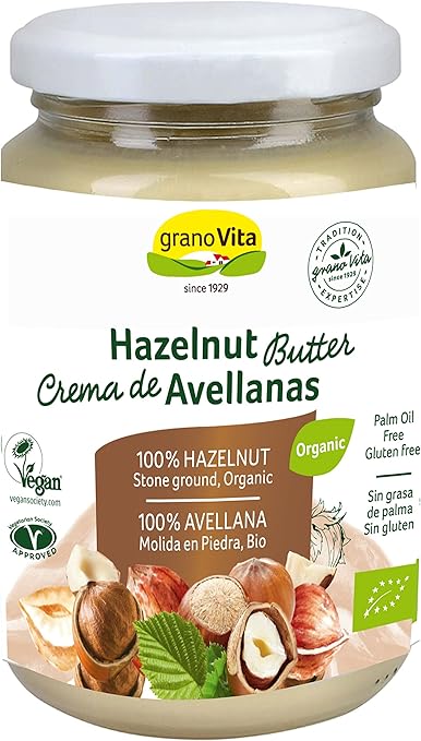 Indicaciones: Crema de avellana ecológica, sin gluten. Se elabora en molino de piedra para mantener los nutrientes y el sabor natural de la avellana aportando una textura cremosa.