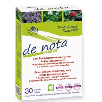 Composicion: Por 2 cápsulas:\ Extractos nebulizados estandarizados de bacopa (Bacopa monnieri L.) 250 mg, ginseng (Panax quinquefoliusL.) 100 mg, taurina 100 mg, ácido L ascórbico (Vitamina C), ginkgo (Ginkgo bilobaL.) 80 mg, lactato ferroso, ácido L glutámico 26 mg, L arginina 26 mg, sulfato de zinc, acetato de DL-alfa tocoferilo (vitamina E), clorhidrato de piridoxina (Vitamina B6), pantotenato cálcico (Vitamina B5), betacaroteno (Vitamina A), yoduro potásico, colecalciferol (Vitamina D), cianocobalamina (vitamina B12), antiaglomerante (estearato de magnesio), agente de carga (celulosa microcristalina), envoltura (gelatina).