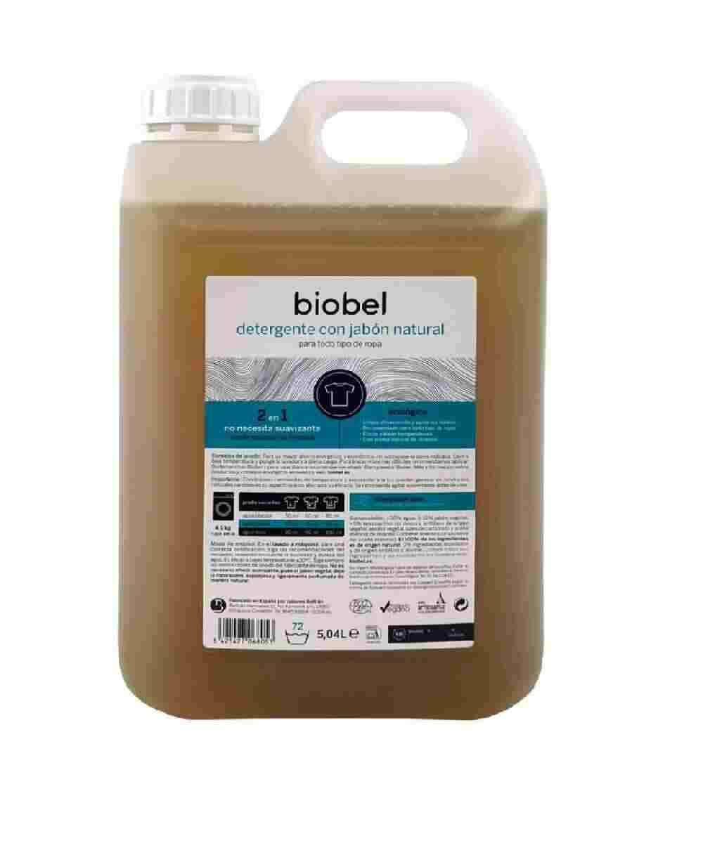 Indicaciones: El detergente ecológico para lavadora de la marca Biobel es una extraordinaria opción ecológica para el lavado de ropa, ya que cuenta con una potente fórmula enriquecida con aceite esencial de lavanda que, además de proporcionar una agradable fragancia, es ideal para lavar todo tipo de prendas en lavadora. Gracias a su eficacia, este detergente ecológico es capaz de dejar un aroma natural duradero en toda la colada, incluso en ciclos de lavado con temperaturas bajas.\ Este producto se diferencia del resto, pues se enriquece con jabón ecológico natural que no solo protege la ropa, sino que también ayuda a prolongar su vida útil, al mismo tiempo que la suaviza. Por otro lado, su composición exclusivamente vegetal y sin componentes etoxilados o de origen animal lo hacen apto para todo tipo de pieles y para el cuidado del medio ambiente. De hecho, la totalidad de sus ingredientes son de origen natural.\ Además, Biobel es un producto 2 en 1 que no requiere suavizante, pues gracias a su fórmula especial, las prendas quedan suaves, esponjosas y perfumadas de manera natural. Asimismo, es un detergente biodegradable y el agua de lavado que se obtiene es apta para riego. Por último, esta fórmula no contiene pictogramas, lo que significa que su uso es seguro y no representa un riesgo para la salud ni para el entorno.