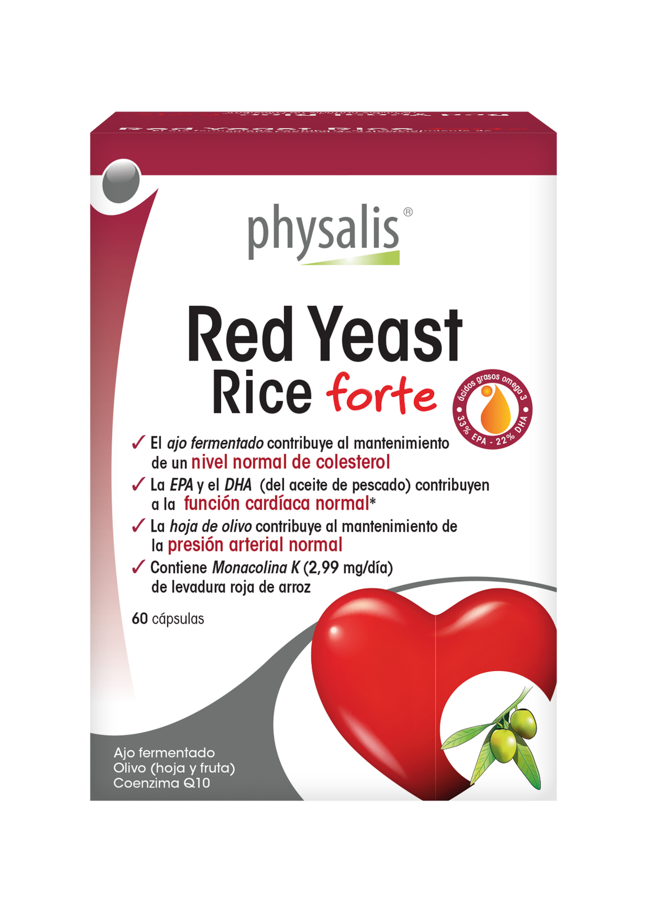 Indicaciones: Contiene Monacolina K bajo su forma activa, un compuesto de origen natural extraído de la levadura de arroz roja que contribuye al mantenimiento de un nivel de colesterol normal. Con excelente aceite de pescado que aporta ácidos omega 3 EPA y DHA que contribuyen a una función cardíaca normal. El extracto de hoja de olivo (con 20% de oleuropeína) completa esta acción y contribuye igualmente al mantenimiento de una tensión arterial normal. Con adicción de un extracto de alta calidad de pulpa de oliva (Mediteanox® a15% de hidroxitirosol) y de coenzima Q10 naturalmente fermentada para completar la acción y aumentar la eficacia.