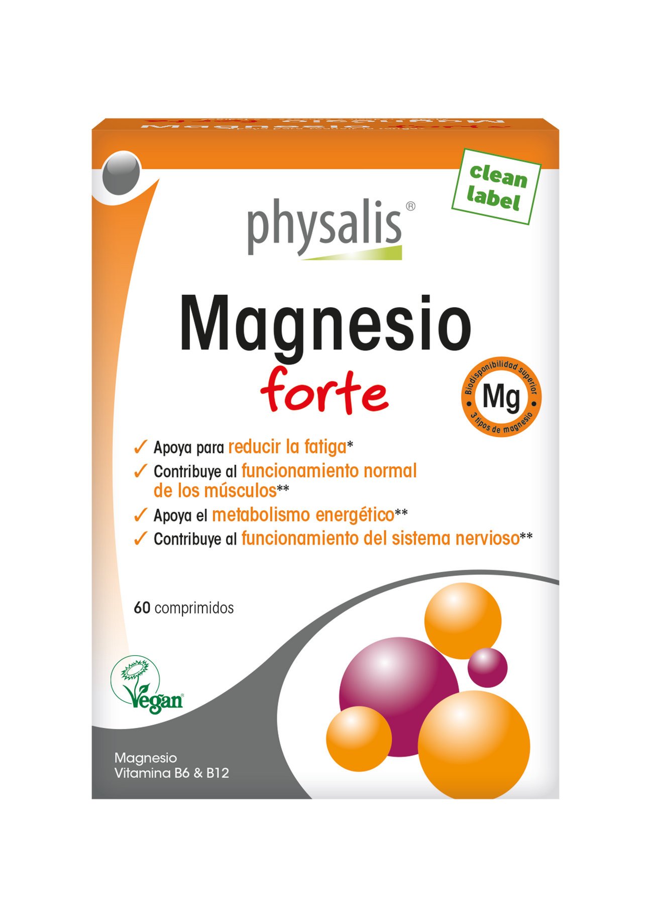 Indicaciones: El magnesio ayuda a disminuir el cansancioy la fatiga y contribuye al funcionamiento normal del sistema nervioso.También contribuye al funcionamiento normal de los músculos. Physalis Magnesio forte contiene una sinergia de tres formas de magnesio de fácil asimilación: el bisglicinato y el glicerofosfato de magnesio, así como magnesio marino extraído de agua de mar rica en minerales (Aquamin® Mg). Producto vegano.