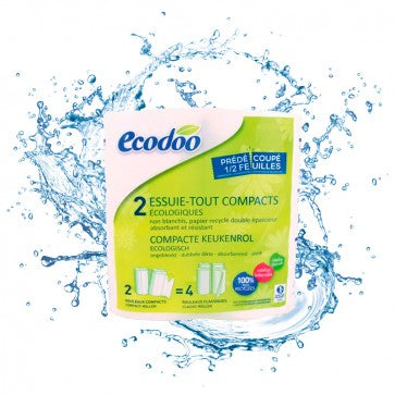 Indicaciones: Papel 100% reciclado absorbente y resistente, de doble espesor y sin blanquear. Presentación en modo de dos rollos compactos en envase completamente biodegradable, a base de componentes naturales de almidón de maíz y derivados del aceite vegetal. 100 hojas equivalen a 50 en un rollo clásico. Precortadas para un uso práctico, ecológico y económico.