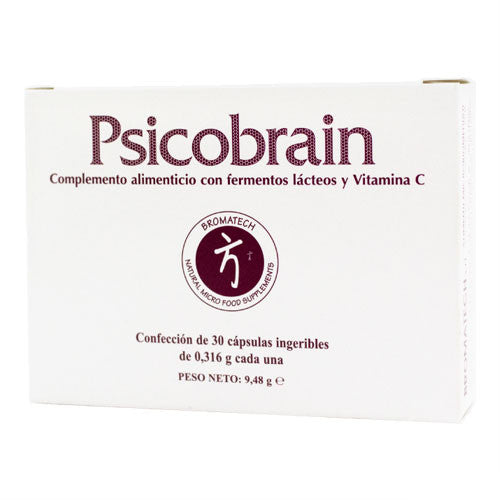 Indicaciones: Suplemento con probióticos y vitamina C que contribuye a la función psicológica normal y al normal funcionamiento del sistema inmune. Contiene además escolzia, indicada para favorecer la relajación. \ \ Psicobrain de Bromatech es un producto que contiene cepas bacterianas con propiedades psicobióticas, es decir, con la capacidad de ayudar al eje intestino cerebro. Además de estas cepas bacterianas, Psicobrain también incluye otros ingredientes activos que pueden ser beneficiosos para dar apoyo a la función cognitiva y al bienestar emocional. Entre los componentes más destacados de Psicobrain se encuentran la Amapola de California, la L-teanina y la Vitamina C. La Amapola de California es conocida por sus efectos calmantes y relajantes, que pueden ayudar en situaciones del estrés. La L-teanina, por su parte, es un aminoácido que se encuentra naturalmente en el té verde y que también puede tener efectos relajantes, reduciendo la sensación de fatiga y apoyando a la calidad del sueño. Finalmente, la Vitamina C es un antioxidante que contribuye a la protección celular frente al daño oxidativo. Gracias a la combinación de estos ingredientes activos, Psicobrain puede contribuir a la función psicológica normal y al normal funcionamiento del sistema nervioso. En resumen, Psicobrain es un producto que puede ayudar al bienestar psicológico y emocional, gracias a su fórmula especial con ingredientes activos de origen natural y sus cepas bacterianas psicobióticas.