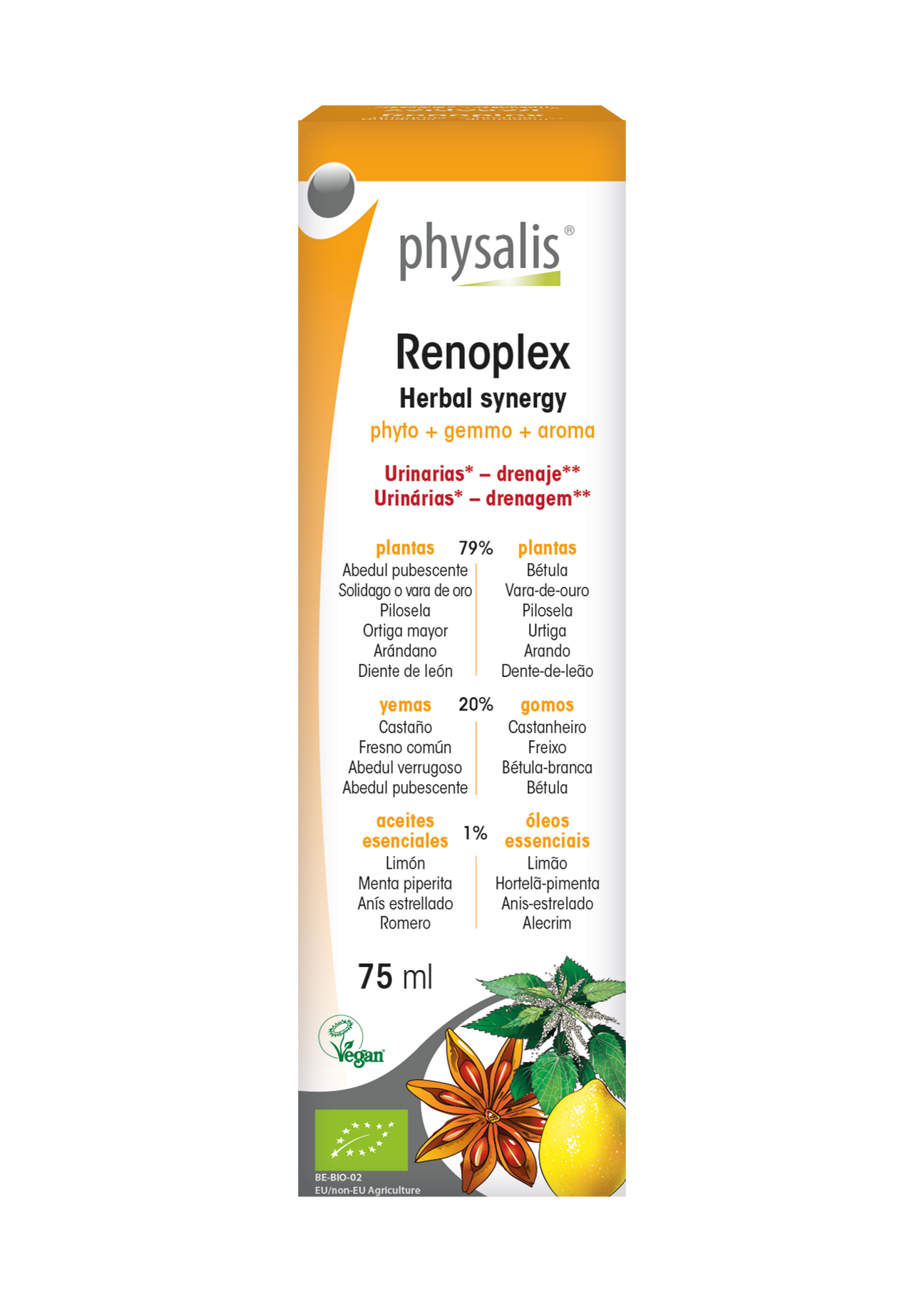 Composicion: Extractos hidro-alcohólicos de abedul pubescente* (20%), solidago o vara de oro*(20%), pilosela* (10%), ortiga mayor* (10%) arándano* (10%) y diente de león*(9%), extractos hidro-alcohólicos glicerinados de yemas de castaño* (6,7%), fresno común* (6,7%), abedul verrugoso* (3,3%), abedul pubescente* (3,3%), aceites esenciales de limón* (0,25%), menta piperita* (0,25%), anís estrellado* (0,25%) y romero* (0,25%).\ \ (*)= Cultivo ecológico.