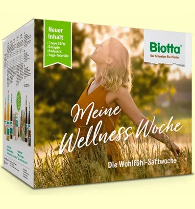 El libro de instrucciones proporciona un plan detallado de lo que puedes consumir durante la Semana Wellness, incluyendo consejos para maximizar tu bienestar a través de la alimentación saludable y el ejercicio, y cómo gestionar los cambios que puedas experimentar durante la semana. El set incluye 11 botellas de 500 ml de zumos Biotta, semillas de lino bio, tisana de hierbas bio y sal de baño VitaBase®.