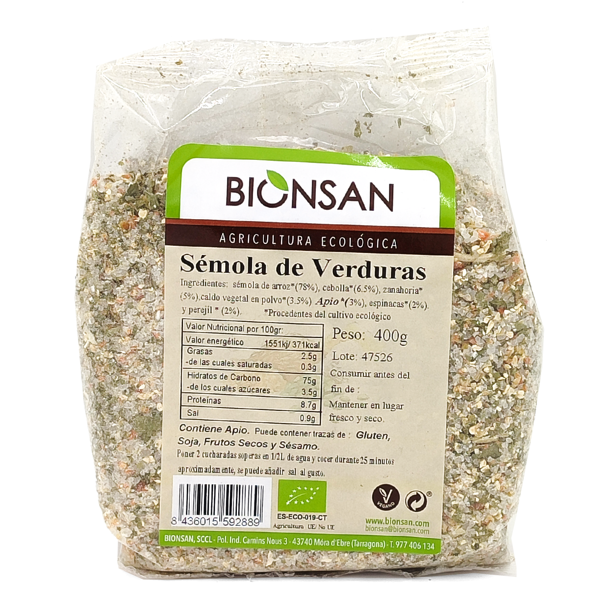 Composicion: Sémola de arroz* 80%, cebolla* 6,5%, zanahoria* 5%, caldo vegetal en polvo* 3,5%, apio* 3%, perejil* 2%.\ \ (*)= Procedente de cultivo ecológico.\ + Puede contener trazas de gluten, soja, frutos secos, sésamo, leche y mostaza.