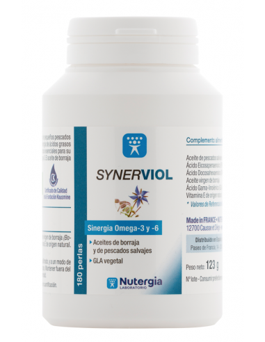 Indicaciones: Asociación original de aceites de pescados salvajes, borraja virgen y vitamina E natural.\ \ Synerviol de la marca Nutergia es una asociación de aceites de pescados salvajes, borraja virgen y vitamina E natural que puede ser de utilidad para el bienestar. Esta combinación proporciona ácido linoléico y gama-linolénico (provenientes de la borraja), así como EPA y DHA (obtenidos de pequeños pescados) que son esenciales para la función coronaria. La presencia de DHA en Synerviol 180 perlas es especialmente relevante, ya que este ácido graso poliinsaturado puede ayudar al normal funcionamiento del cerebro. La composición de Synerviol incluye aceite de pescados salvajes provenientes de anchoas y sardinas, junto con aceite de borraja virgen de primera presión en frío y vitamina E natural. Todo ello se encuentra en una perla que utiliza gelatina de pescado y glicerol como ingredientes para su encapsulación.