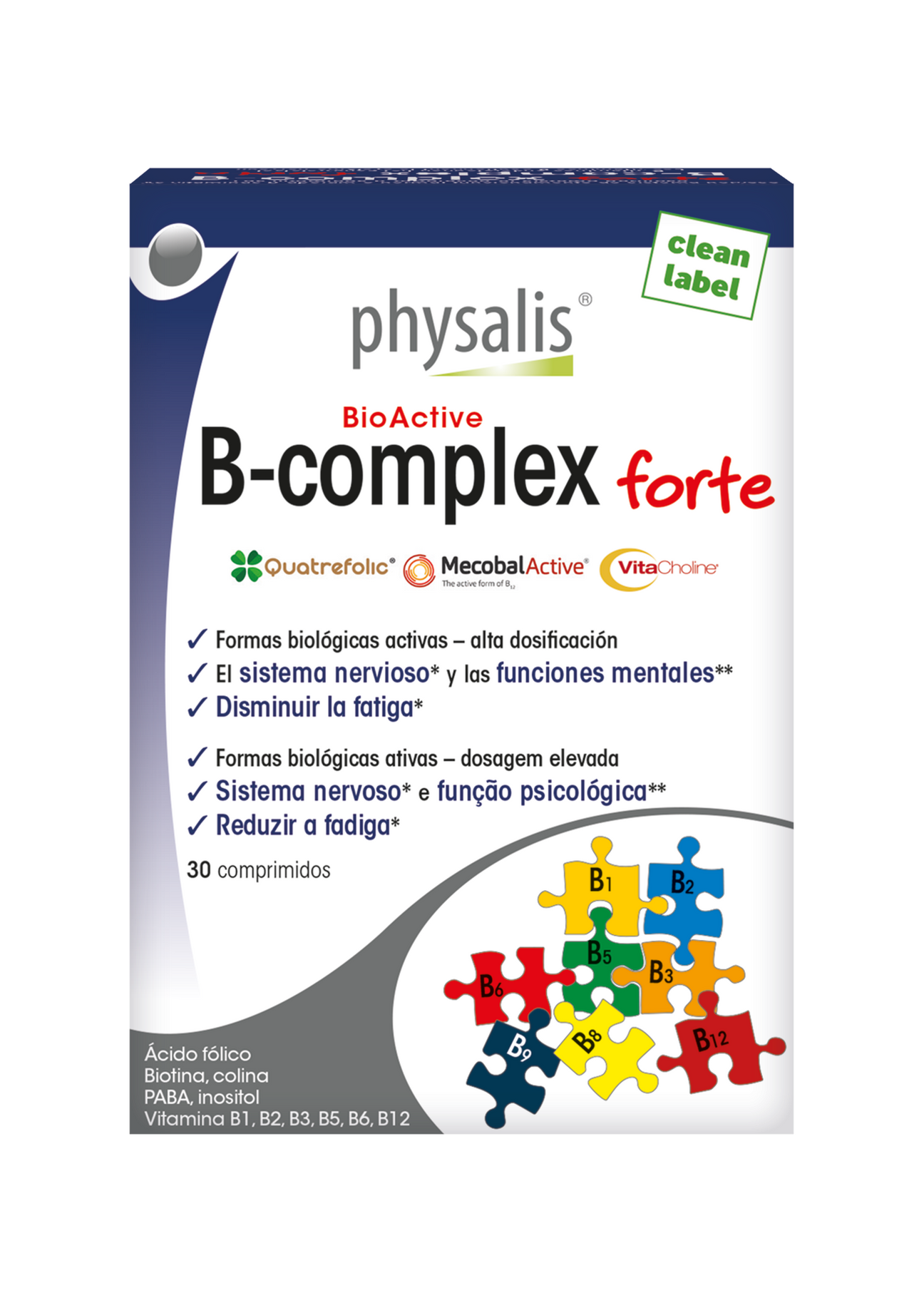 Composicion: Por 1 comprimido:\ Vitamina B1 .........50 mg\ Vitamina B2 .........50 mg\ Vitamina ..............B3 mg\ Vitamina B5..........50 mg\ Vitamina B6 .........6 mg\ Ácido fólico (Quatrefolic®) .............500 µg\ Vitamina B12 (MecobalActive®)......500 µg\ Biotina ........................................500 µg\ Bitartrato de colina (VitaCholine®)..100 mg\ Inositol........................................100 mg\ PABA...........................................100 mg