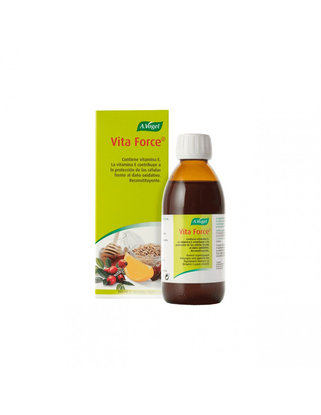 Vitaforce Jarabe 200ml A. Vogel. Es un concentrado natural de frutas y cereales ricos en vitaminas. Su equilibrada fórmula a base de cereales, frutas, levadura de cerveza, polen y miel, aporta al organismo la vitalidad que el cuerpo necesita.